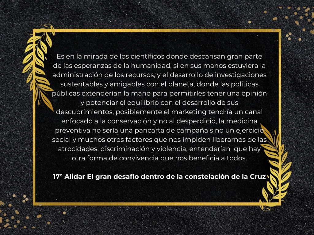 It is in the eyes of scientists where a large part of humanity’s hopes rest, if the administration of resources were in their hands, and the development of sustainable and planet-friendly research, public policies would extend their hand to allow them to have an opinion and enhance the balance with the development of their discoveries, possibly marketing would have a channel focused on conservation and not waste, preventive medicine would not be a campaign banner but a social exercise and many other factors that prevent us from freeing ourselves of atrocities, discrimination and violence, they would understand that there is another way of coexistence that benefits us