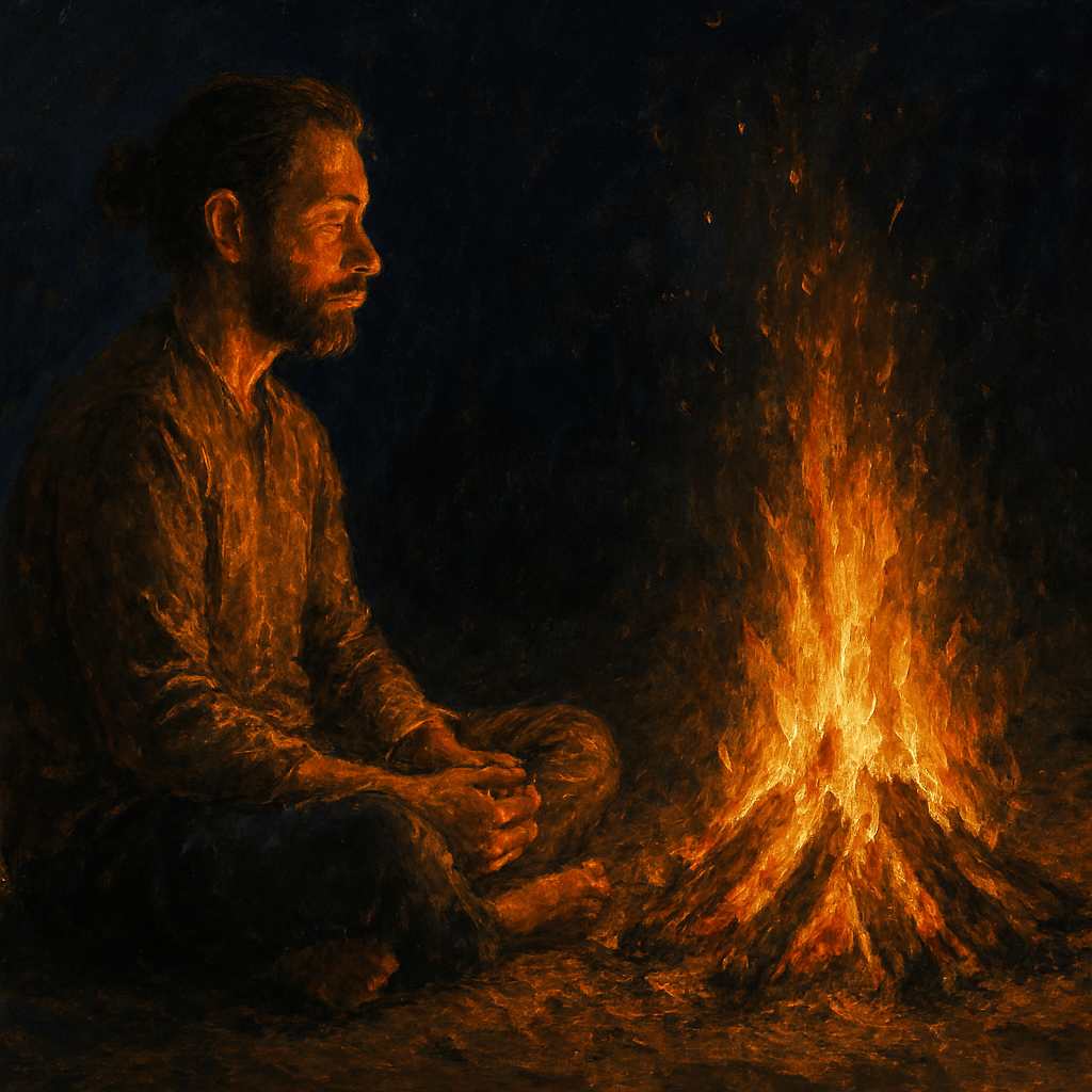 Entonces nos quedamos en eso que nos transmite el claroscuro, aquello que nos transmite recogimiento y contemplación, con el contraste entre la calidez del fuego y la profundidad de la noche, experimentando un ritual íntimo entre el humano y la energía de las llamas.